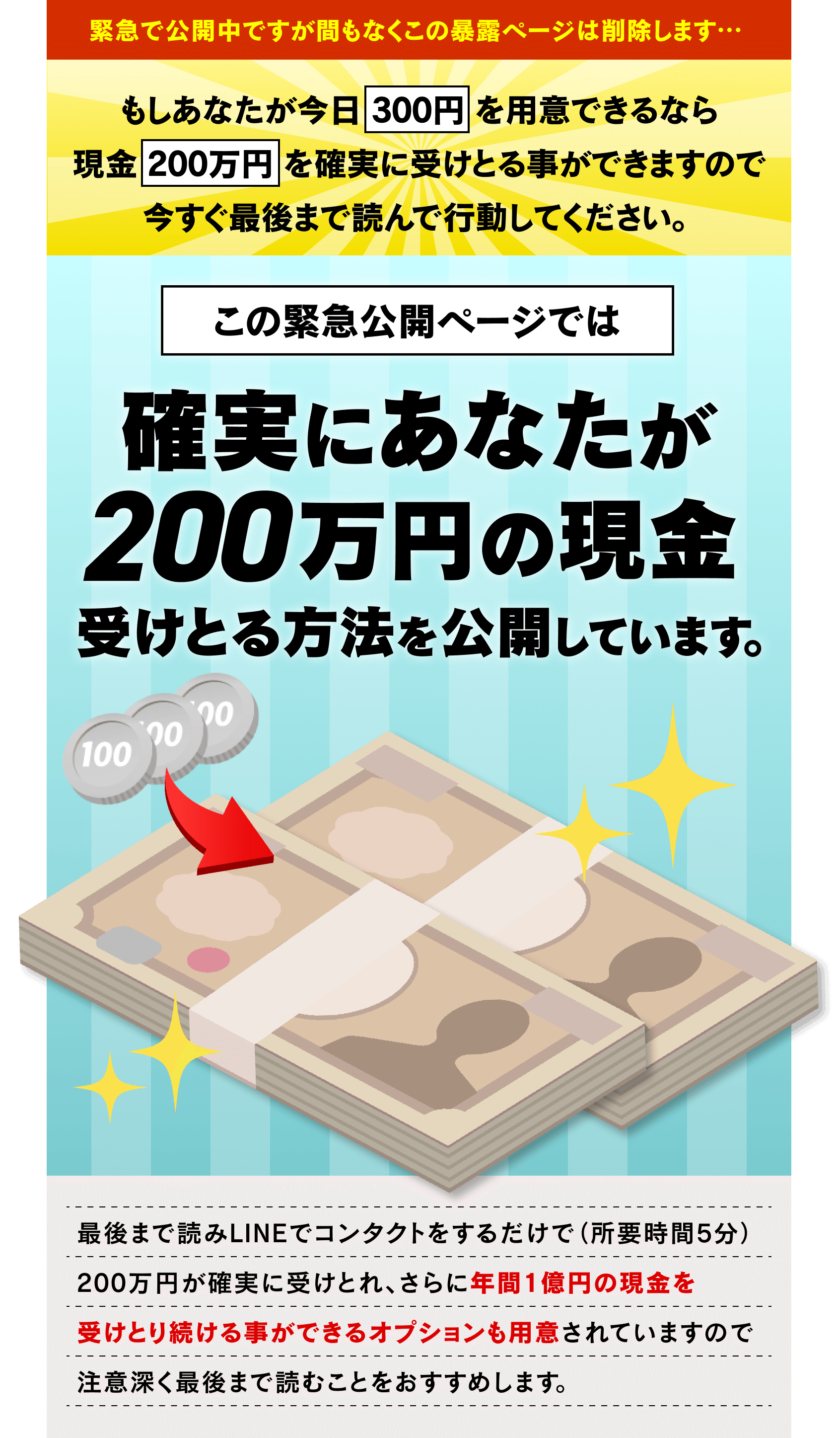 あなたは300円の元手からスタートして確実に200万円を手に入れることができ、さらに年間1億円が受け取れる妙なスキームへ参加できるオプションが受け取れます。